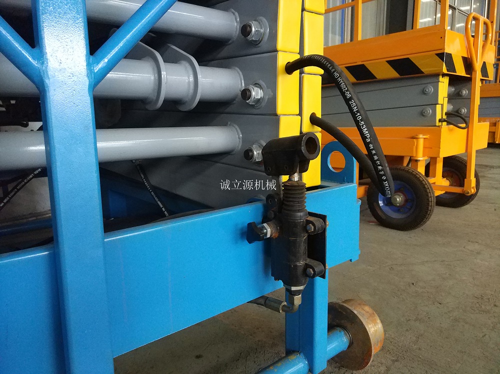 18865926528剪叉式升降平臺介紹 本升降平臺由行走機(jī)構(gòu)、液壓機(jī)構(gòu)、電動(dòng)控制機(jī)構(gòu)、支撐機(jī)構(gòu)組成的一種升降設(shè) 備。液壓油齒輪泵形成一定的壓力,經(jīng)濾油器、電磁換向閥、節(jié)流閥、液控單向閥