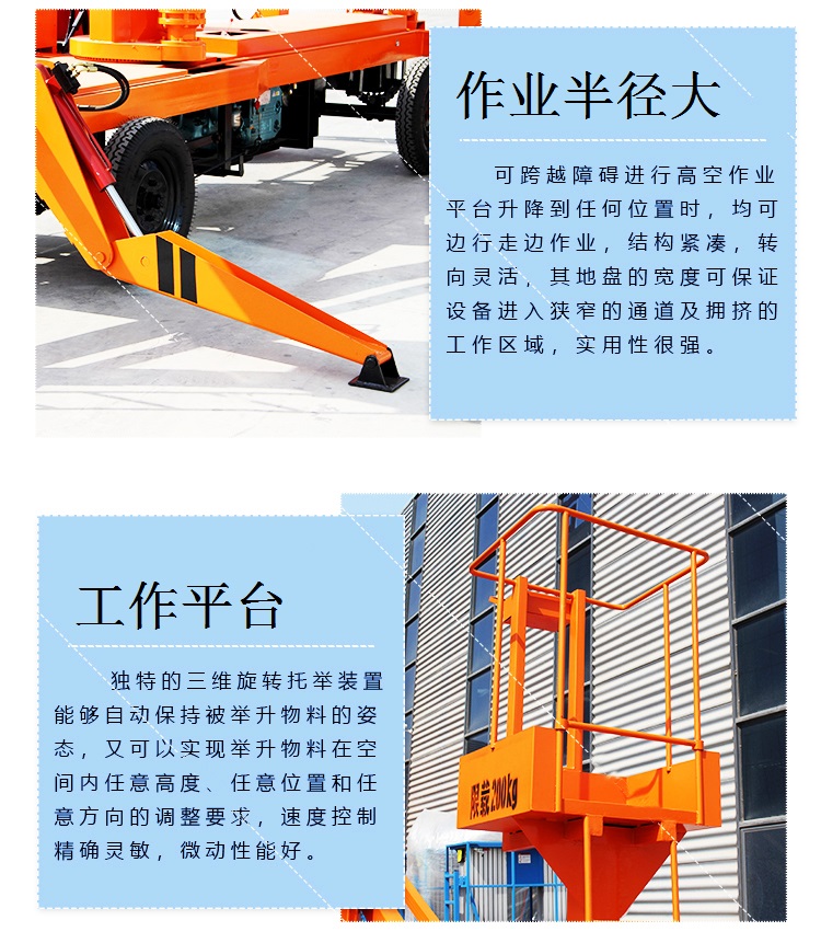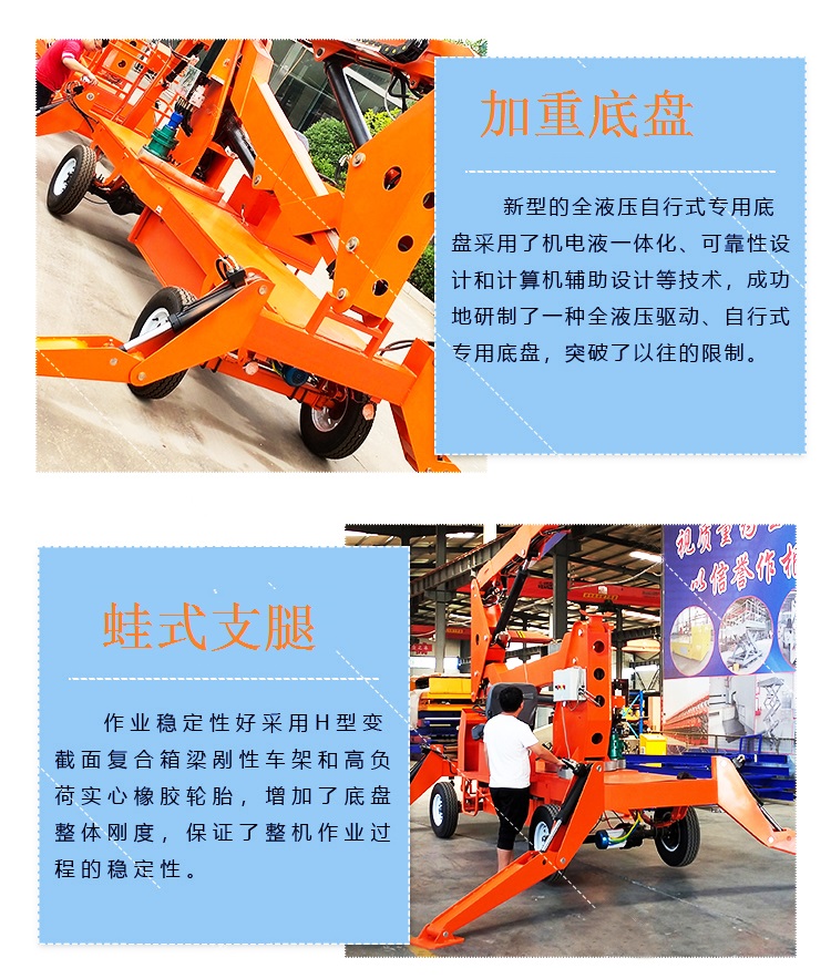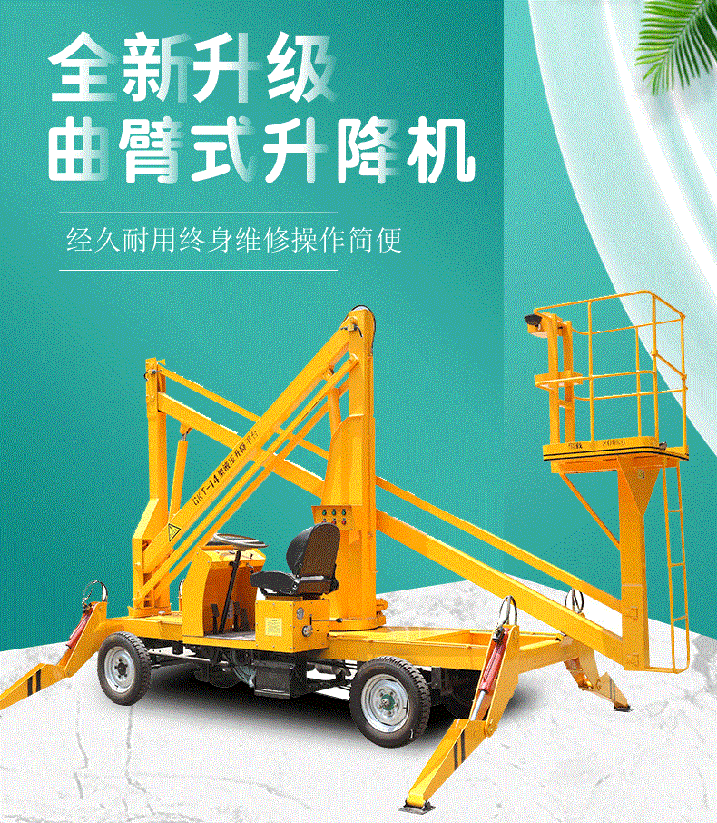 18865926528曲臂式液壓升降機(jī)產(chǎn)品簡介及參數(shù): 本設(shè)備是垂直式、剪叉式升降機(jī)的替代產(chǎn)品,該機(jī)可用發(fā)動(dòng)機(jī)、蓄電池等為 動(dòng)力,發(fā)動(dòng)機(jī)均是電啟動(dòng),四條液壓伸縮支腿、液壓升降、可自行走,