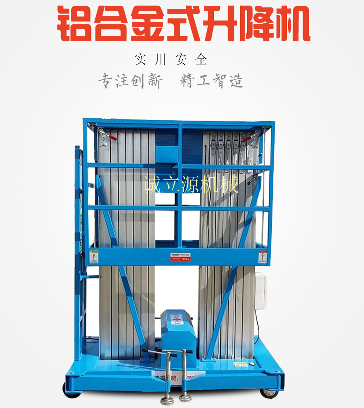 鋁合金升降平臺采用高強度優(yōu)質(zhì)鋁合金型材,具有造型美觀、體積小、重量輕、 升降平穩(wěn)、安全可靠等優(yōu)點,可上下操作,廣泛用于工廠、賓館、餐廳、車站、機場 影劇院、展覽館等場所,是保養(yǎng)設備、高空涂刷、調(diào)換燈具、電器、清潔等用途的升 降設備。單桅柱豪華鋁合金式升降平臺:該系列產(chǎn)品為室內(nèi)型,廣泛適用于星級酒 店,大型超市等各行業(yè)大廳、廠房內(nèi)的高空作業(yè),具有升降平穩(wěn),操作方便,能 進入一般門廳,可進出電梯且耗電少、無污染、工作時不傷地面,可用于貼墻工 作及探出作業(yè),工作無死角。。雙桅柱豪華鋁合金式升降平臺:全新設計的新一代產(chǎn) 品,整體采用高強度鋁型材型材精制而成,由于型材強度高,使升降臺的偏轉(zhuǎn)與 擺動小。采用雙桅柱式結(jié)構,載重量大,平臺面積大,穩(wěn)定性好,運轉(zhuǎn)靈活,推 行方便。它輕盈的外觀,能在小空間內(nèi)發(fā)揮較高的舉升能力。該升降機廣泛用于 廠房、賓館、大廈、商場、車站、機場、體育場等。可用作電力線路、照明電器、 高架管道等安裝維護,高空清潔等高空作業(yè)。三桅柱豪華鋁合金式升降平臺: 三 組桅柱支撐作業(yè)平臺同步升降,底盤支腿結(jié)構同單雙桅柱式平臺,具有超大的載 重量。整體升降式護欄裝置,強度好,運輸時大幅度地降低整機自身高度,裝卸 十分方便。該升降機承載能力強,適合于兩人(可攜帶一定的重量工具和材料) 同時登高作業(yè);還可根據(jù)不同環(huán)境訂制各種非標產(chǎn)品,以滿足不同需要。四桅柱豪 華鋁合金式升降平臺: 整體采用高強度鋁型材精制而成,由于型材強度高,采用四 桅柱式結(jié)構,穩(wěn)定性好,運轉(zhuǎn)靈活,載重量大,平臺面積大,推行方便。它輕盈 的外觀,能在小空間內(nèi)發(fā)揮較高的舉升能力。使升降平坦臺的擺動減小。該升降 機廣泛用于廠房、賓館、大廈、商場、車站、機場、體育場、軍隊、港口等???用作電力線路、照明電器、高架管道等安裝維護,高空清潔等高空作業(yè)。整體采 用高強度的鋁型材作為升降立柱,起升動力經(jīng)過液壓泵站是液壓油缸伸縮,帶動 鏈條傳動能夠上下升降,使高空作業(yè)變得方便快捷!六桅柱豪華鋁合金式升降平臺: 整體采用高強度鋁型材精制而成,由于型材強度高,采用六桅柱式結(jié)構,穩(wěn)定性 好,運轉(zhuǎn)靈活,載重量大,平臺面積大,推行方便。它輕盈的外觀,能在極小的 空間內(nèi)發(fā)揮較高的舉升能力。多柱式使升降臺的擺動減小。該升降機廣泛用于廠 房、賓館、大廈、商場、車站、機場、、軍隊、港口、體育場等。(根據(jù)需要可定 制鋁合金升降舞臺等,以上款式還可以加裝到汽車底盤上,讓使用便捷、高效。)