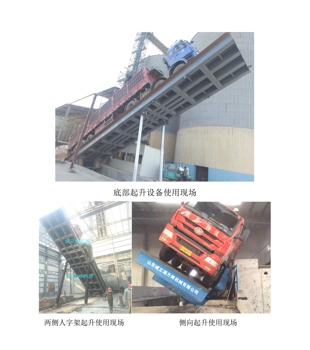 山東誠立源升降機械有限公司的液壓側(cè)翻后翻自動卸車機廣泛用于糧油加 工,飼料加工,煤炭、水泥、造紙制漿,港口、電廠、焦化廠、車站、碼頭貨 廠提供了一種新型液壓翻板卸車設(shè)備。產(chǎn)品經(jīng)濟實惠、技術(shù)先進、高效可靠。 液壓翻板卸車機保障了工作人員的安全性。通常用來裝卸工礦企業(yè)內(nèi)貨車上的 散裝物料,設(shè)備使用壽命長,為工作人員帶來了便捷。液壓翻板卸車機轉(zhuǎn)軸部 分增加了耐磨損材料,使用壽命長;整機運行平穩(wěn),本卸車機的推廣應(yīng)用,提 高了工作效率,減輕了勞動人力,使一般人員都能完成卸車工作,達(dá)到卸料速 度快的目的。液壓翻板卸車機在各大領(lǐng)域被廣泛應(yīng)用,它解決了人力成本高的 問題,大大提高了生產(chǎn)效率和工作效率,卸車機的 PLC 控制系統(tǒng)更加保證了卸 車機整個卸車過程的安全及正常運作。